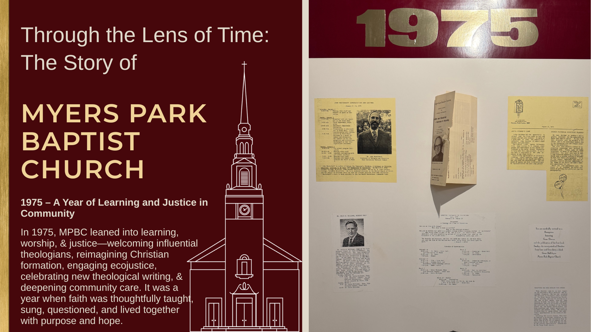 In 1975, Myers Park Baptist Church leaned decisively into the work of thoughtful formation—asking not only what the church believed, but how faith was lived, taught, and shared. Through visiting scholars, creative worship conversations, public commitments to justice and care, and new ways of strengthening community connections, the congregation revealed a deep desire to nurture a faith that was intellectually curious, spiritually grounded, and visibly engaged with the wider world.